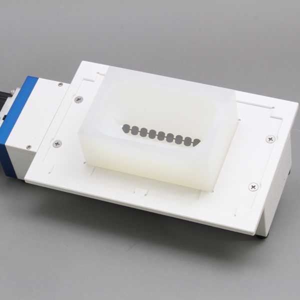 This uses a specially designed paddle that lays horizontally in a sculpted reservoir. The paddle is stainless steel coated with parylene and driven by a magnetic tumble stirrer.