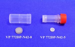 This photo shows a Thomson eXtractor 3D™ filter vial next to several V&P PVDF encapsulated magnetic stir discs.