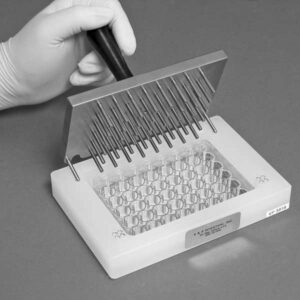 Although the slots in the pin are a precise volume, the liquid that is transferred is usually more. The reason for this is due to the surface tension of the liquid causing the liquid in the slot to “bow out” thus increasing the volume of the liquid in the slot. If is important for you to transfer exactly a certain volume we can make custom slots to match the surface tension characteristics of your liquid