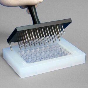 Although the slots in the pin are a precise volume, the liquid that is transferred is usually more. The reason for this is due to the surface tension of the liquid causing the liquid in the slot to “bow out” thus increasing the volume of the liquid in the slot. If is important for you to transfer exactly a certain volume we can make custom slots to match the surface tension characteristics of your liquid