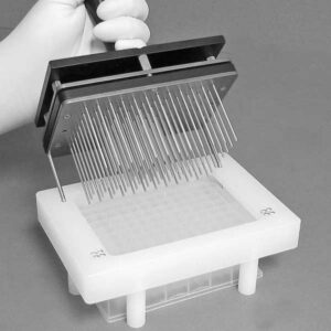 Although the slots in the pin are a precise volume, the liquid that is transferred is usually more. The reason for this is due to the surface tension of the liquid causing the liquid in the slot to “bow out” thus increasing the volume of the liquid in the slot. If is important for you to transfer exactly a certain volume we can make custom slots to match the surface tension characteristics of your liquid