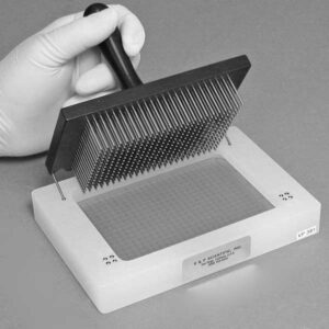 Although the slots in the pin are a precise volume, the liquid that is transferred is usually more. The reason for this is due to the surface tension of the liquid causing the liquid in the slot to “bow out” thus increasing the volume of the liquid in the slot. If is important for you to transfer exactly a certain volume we can make custom slots to match the surface tension characteristics of your liquid
