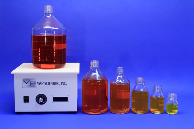 The conventional horizontal Magnetic Stirrer technology has been around since 1944. This system uses a motor to spin a drive magnet whose moving magnetic field connects with the magnetic field of a stir bar causing the stir bar to spin on a horizontal plane in a vessel above the drive magnet. V&P Scientific has improved that basic system.