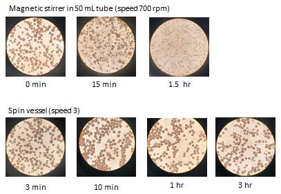 SpinVessel® data demonstrating 5 different particulates (HEK cells, CHO cells, Cytodex Microcarrier beads, Magnetic beads, and Silica beads) being uniformly suspended horizontally and vertically in different SpinVessel®s is also presented in the SLAS Technology paper.